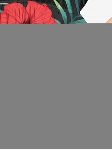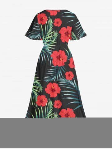 Plus Size Hibiscus Flower Tropical Leaf Print Split Hawaii Midi Dress - Black - S