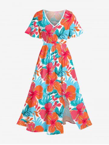 Graphic Dresses > Plus Size Hibiscus Flower Tropical Leaf Print Split Hawaii Midi Dress