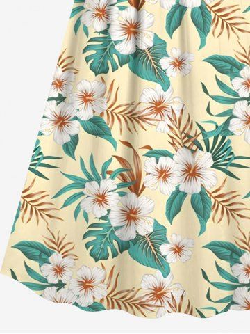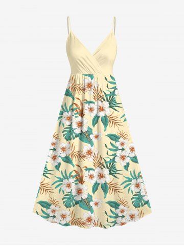 Plus Size Hibiscus Flower Tropical Leaf Print Surplice Hawaii Cami Dress - Beige - M