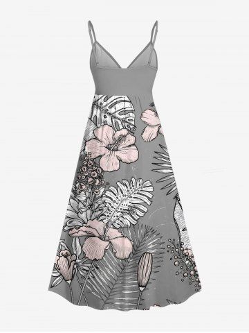 Plus Size Hibiscus Flower Tropical Leaf Print Surplice Hawaii Cami Dress - Gray - Xs