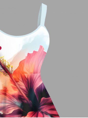 Plus Size Hibiscus Flower Tropical Leaf Watercolor Print Hawaii Tank Dress - Red - 3x