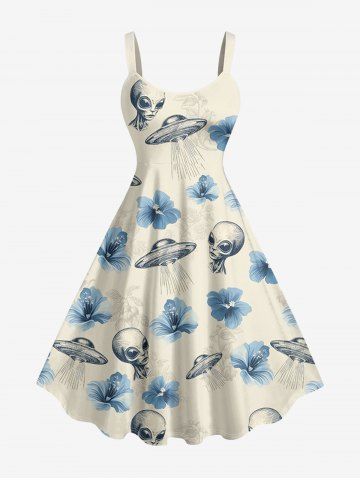 Graphic Dresses > Plus Size Hibiscus Flowers Alien UFO Print Hawaii Tank Dress