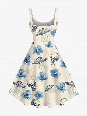Graphic Dresses > Plus Size Hibiscus Flowers Alien UFO Print Hawaii Tank Dress