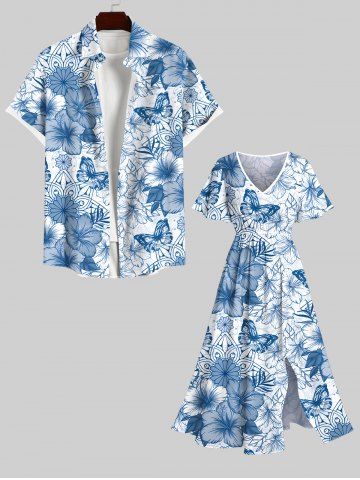 Plus Size Hibiscus Flowers Leaf Butterfly Print Split Hawaii Midi Dress - Blue - M