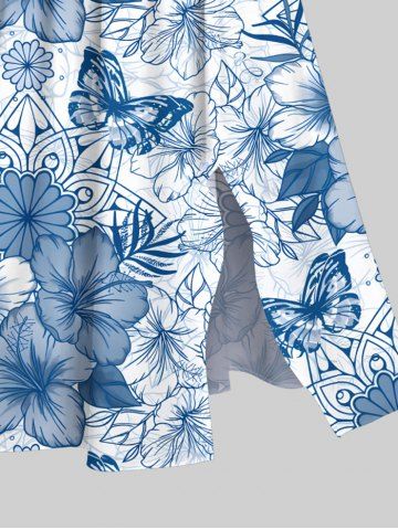 Plus Size Hibiscus Flowers Leaf Butterfly Print Split Hawaii Midi Dress - Blue - 5x