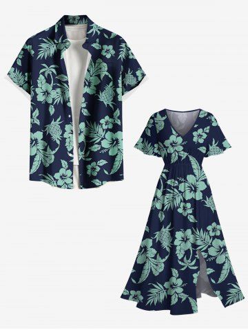 Hibiscus Flowers Leaf Coconut Tree Pineapple Print Plus Size Matching Hawaii Beach Outfit For Couples