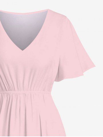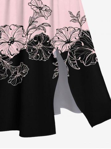 Plus Size Hibiscus Flowers Leaf Colorblock Print Split Hawaii Midi Dress - Light Pink - S