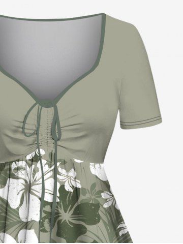 Plus Size Hibiscus Flowers Leaf Print Cinched Hawaii Dress - Light Green - Xxs