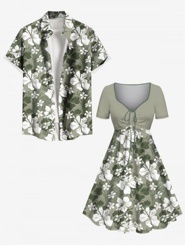 Plus Size Hibiscus Flowers Leaf Print Cinched Hawaii Dress - Light Green - L