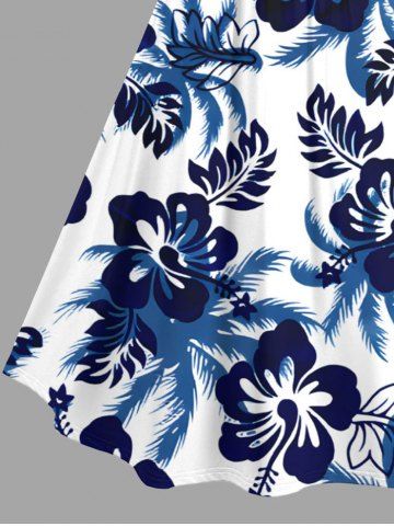 Plus Size Hibiscus Flowers Leaf Print Ruched Lattice Crisscross Straps Hawaii Dress - Deep Blue - L