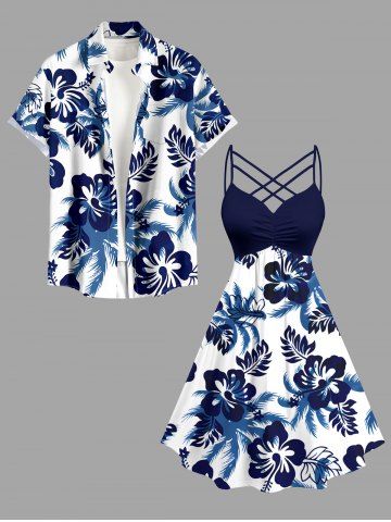 Plus Size Hibiscus Flowers Leaf Print Ruched Lattice Crisscross Straps Hawaii Dress - Deep Blue - 6x