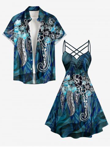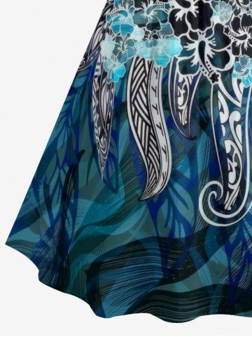 Graphic Dresses > Plus Size Hibiscus Flowers Leaf Print Ruched Lattice Crisscross Straps Hawaii Dress