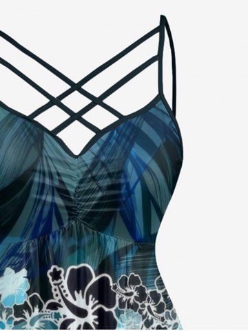 Plus Size Hibiscus Flowers Leaf Print Ruched Lattice Crisscross Straps Hawaii Dress - Black - 4x
