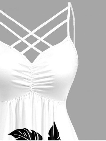 Plus Size Hibiscus Flowers Leaf Print Ruched Lattice Crisscross Straps Hawaii Dress - White - 3x