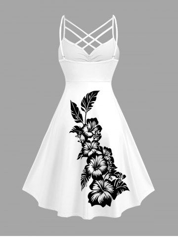 Plus Size Hibiscus Flowers Leaf Print Ruched Lattice Crisscross Straps Hawaii Dress - White - 4x