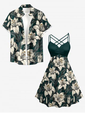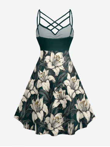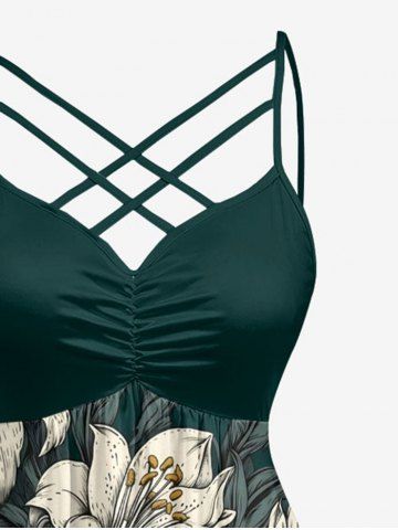 Plus Size Hibiscus Flowers Leaf Print Ruched Lattice Crisscross Straps Hawaii Dress - Deep Green - Xs