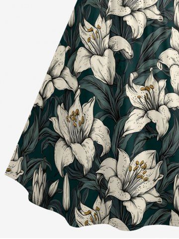 Plus Size Hibiscus Flowers Leaf Print Ruched Lattice Crisscross Straps Hawaii Dress - Deep Green - L