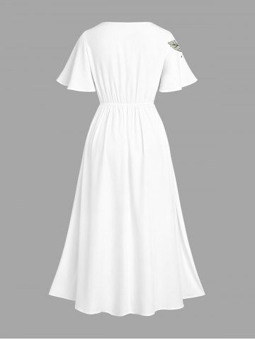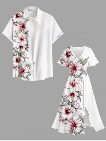 Plus Size Hibiscus Flowers Leaf Print Split Hawaii Midi Dress - White - M