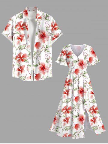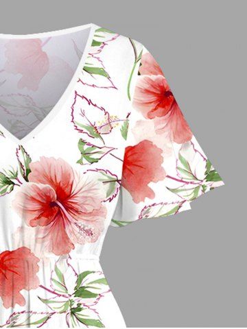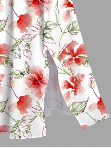 Plus Size Hibiscus Flowers Leaf Print Split Hawaii Midi Dress - White - S