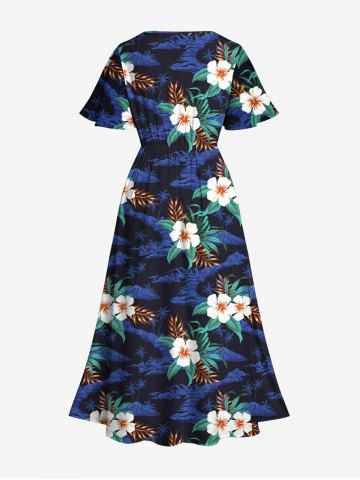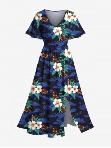 Plus Size Hibiscus Flowers Leaf Print Split Hawaii Midi Dress - Navy Blue - 6x