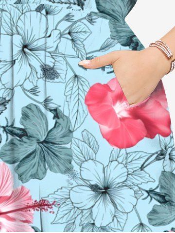Plus Size Hibiscus Flowers Leaf Print Split Hawaii Midi Dress - Powder Blue - L