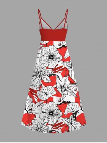 Plus Size Hibiscus Flowers Leaf Print Surplice Hawaii Cami Dress - Red - Xs
