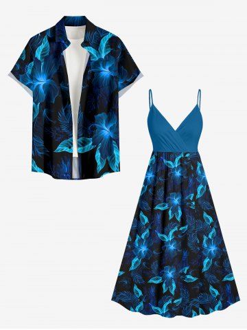 Plus Size Hibiscus Flowers Leaf Print Surplice Hawaii Cami Dress - Midnight Blue - L