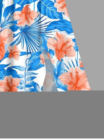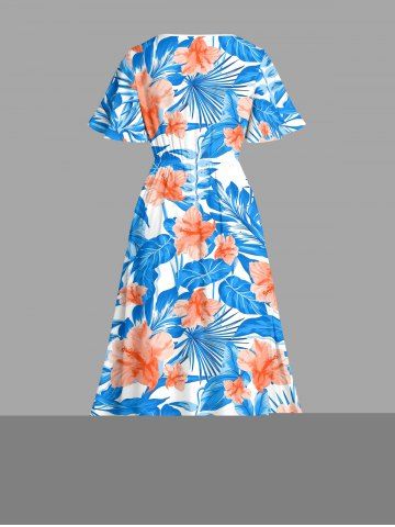 Plus Size Hibiscus Flowers Leaf Print Surplice Hawaii Midi Dress - Sky Blue - S