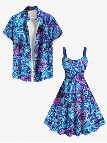 Plus Size Hibiscus Flowers Leaf Snail Print Hawaii Tank Dress - Sky Blue - 6x
