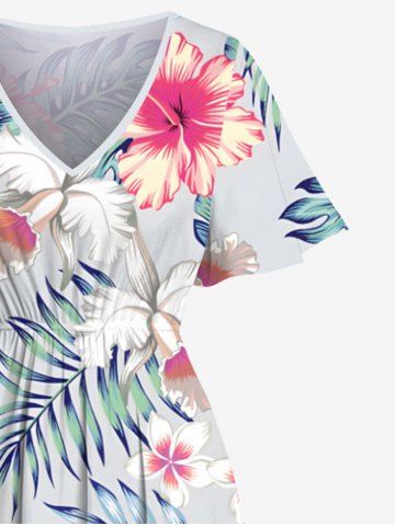 Plus Size Hibiscus Flowers Leaf Tropical Print Split Hawaii Midi Dress - Light Gray - 1x