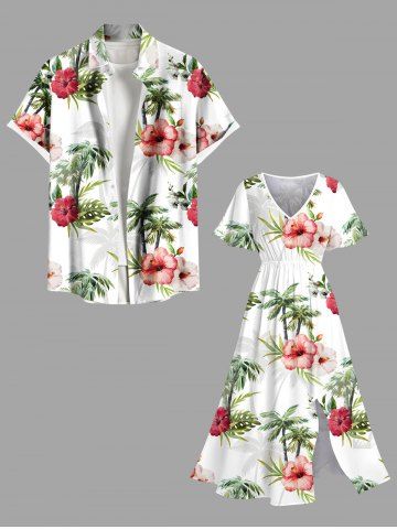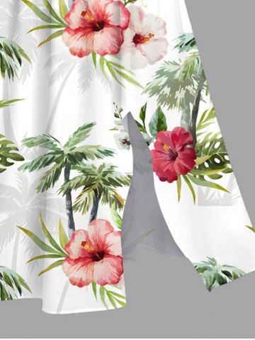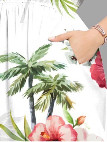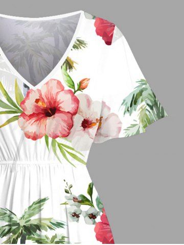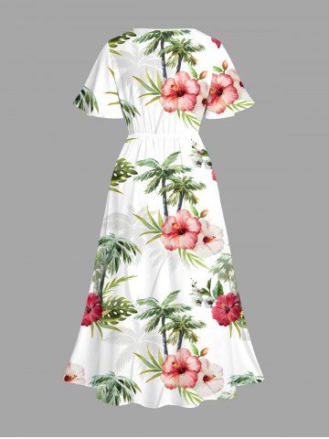 Plus Size Hibiscus Flowers Leaf Tropical Print Split Hawaii Midi Dress - White - 5x
