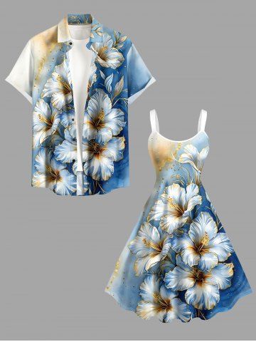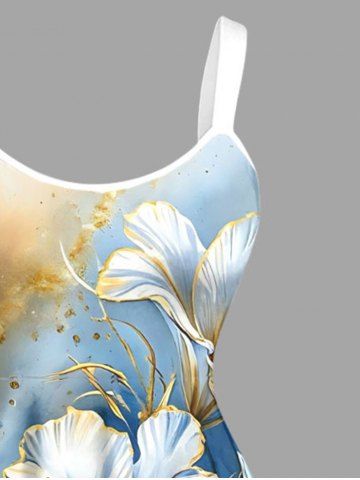 Plus Size Hibiscus Flowers Ombre Metallic Print Hawaii Tank Dress - Blue - 5x