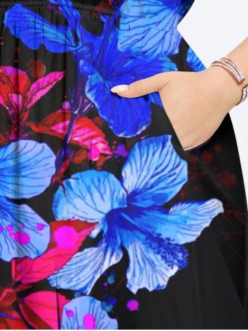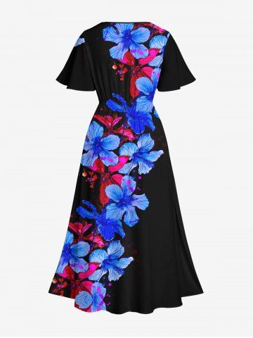 Plus Size Hibiscus Flowers Paint Splatter Print Split Hawaii Midi Dress - Black - 5x
