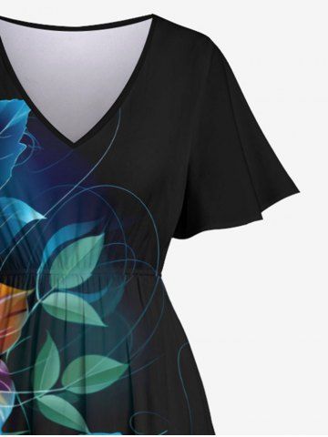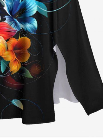 Plus Size Hibiscus Flowers Print Split Hawaii Midi Dress - Black - 3x