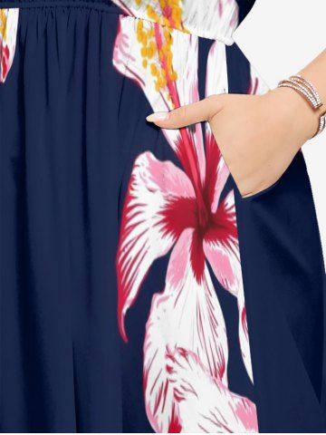 Plus Size Hibiscus Flowers Print Split Hawaii Midi Dress - Midnight Blue - Xxs