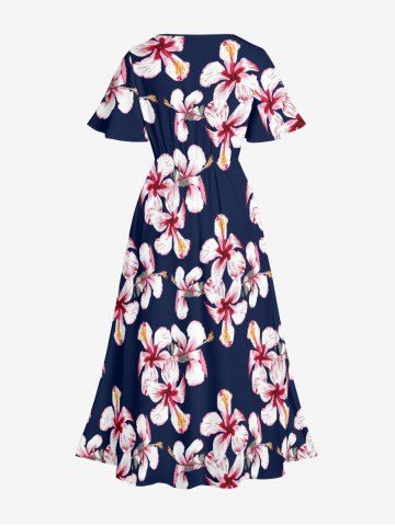 Plus Size Hibiscus Flowers Print Split Hawaii Midi Dress - Midnight Blue - Xs