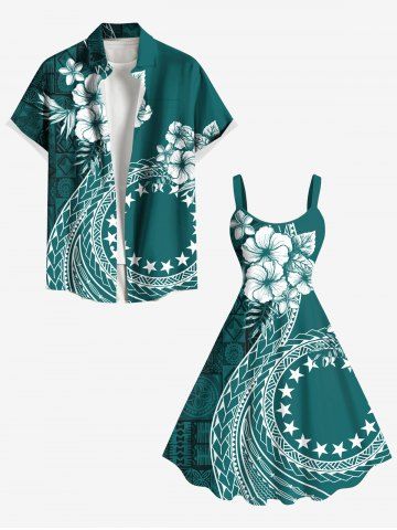 Plus Size Hibiscus Flowers Stars Scarf Print Hawaii Tank Dress - Deep Green - L