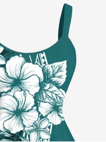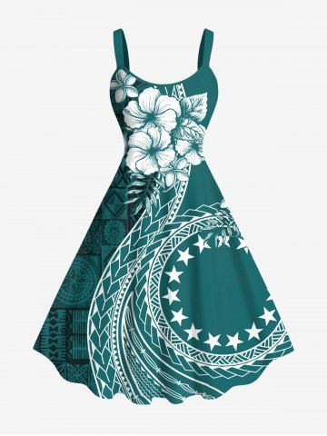 Plus Size Hibiscus Flowers Stars Scarf Print Hawaii Tank Dress - Deep Green - 2x