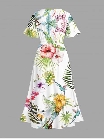 Plus Size Hibiscus Flowers Tropical Leaf Pineapple Bird Print Split Hawaii Midi Dress - White - L