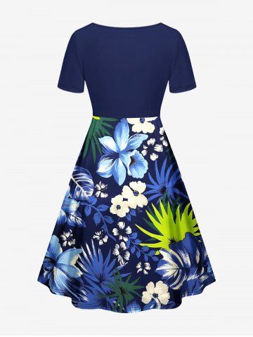 Plus Size Hibiscus Flowers Tropical Leaf Print Cinched Hawaii Dress - Sky Blue - 5x