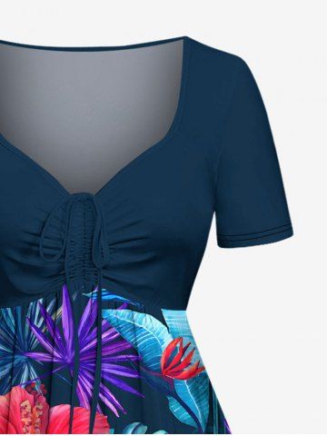 Plus Size Hibiscus Flowers Tropical Leaf Print Cinched Hawaii Dress - Navy Blue - 2x