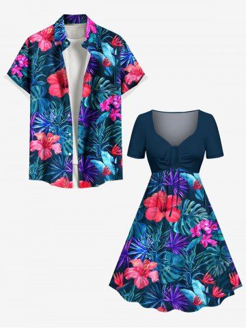 Plus Size Hibiscus Flowers Tropical Leaf Print Cinched Hawaii Dress - Navy Blue - 4x