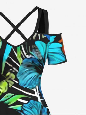 Plus Size Hibiscus Flowers Tropical Leaf Print Cold Shoulder Crisscross Hawaii Maxi Dress - Green - M