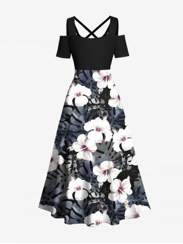Plus Size Hibiscus Flowers Tropical Leaf Print Cold Shoulder Crisscross Hawaii Maxi Dress - Black - L