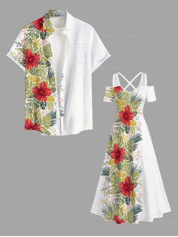 Plus Size Hibiscus Flowers Tropical Leaf Print Cold Shoulder Crisscross Hawaii Maxi Dress - White - 2x