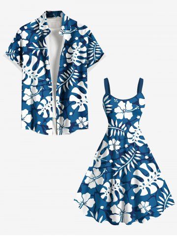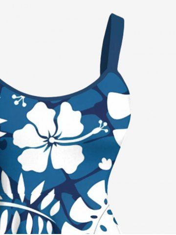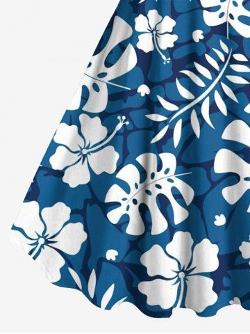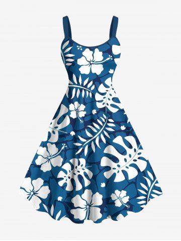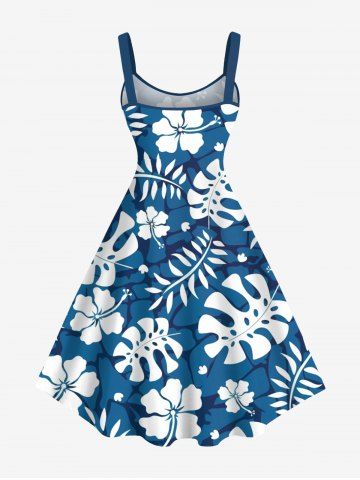 Plus Size Hibiscus Flowers Tropical Leaf Print Hawaii Tank Dress - Blue - S