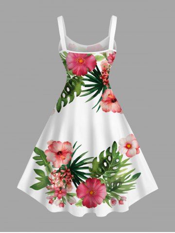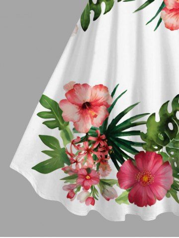 Plus Size Hibiscus Flowers Tropical Leaf Print Hawaii Tank Dress - White - S