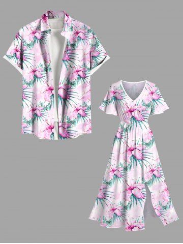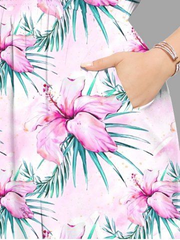 Plus Size Hibiscus Flowers Tropical Leaf Print Split Hawaii Midi Dress - Light Pink - 6x