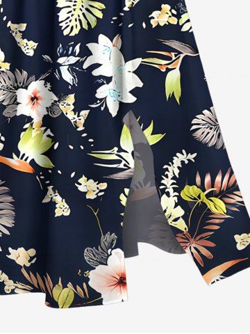 Plus Size Hibiscus Flowers Tropical Leaf Print Split Hawaii Midi Dress - Black - S