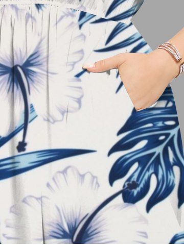 Plus Size Hibiscus Flowers Tropical Leaf Print Split Hawaii Midi Dress - White - 6x